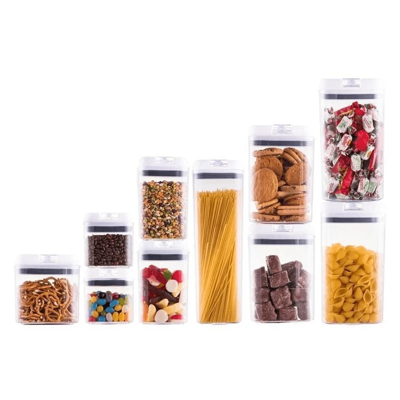 - BPA-free and durable plastic containers with airtight seal to keep dry goods fresh longer