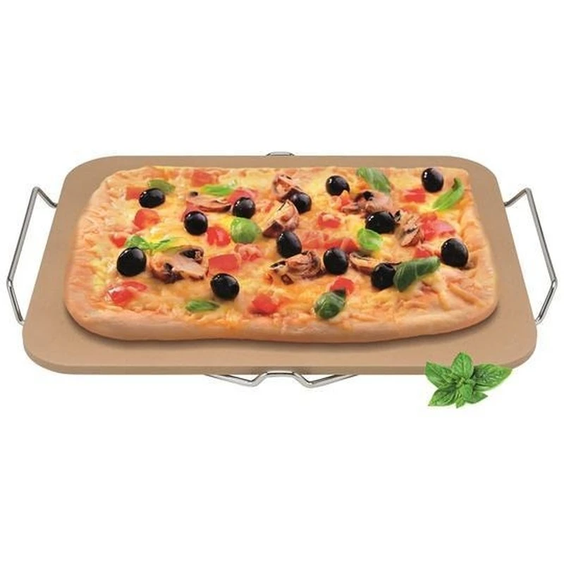 Avanti Rectangular Pizza Stone is convenient for heating and re-heating ready-made frozen pizza and baked goods. The wire handle rack allows the heated stone to be safely transported to the serving table. It is secret to crusts that come out of the oven uniformly browned and crispy. This baking stone is terrific for other baked goods such as bread and pastries, too. The convenient serving rack allows you to bring the stone to the table, so serving is easy.