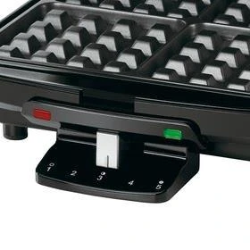 - Electric waffle maker with non-stick baking plates that makes four deep-pocket Belgian waffles