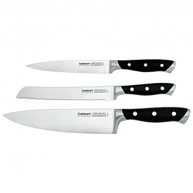 Hold your meat steady with the long prongs of this ice hardened stainless steel carving fork, then carve the finest slices of rare beef or turkey with the superior blade of the perfectly balanced carving knife. This exceptionally sharp, hand honed kitchen marvel includes a triple riveted ergonomically designed handle guaranteeing comfort and excellent leverage. Ice hardened knives are hardened from the core, creating more hard metal throughout the blade. Wash and dry your high quality stainless blades immediately after use to maintain the remarkable quality that comes with a lifetime warranty.