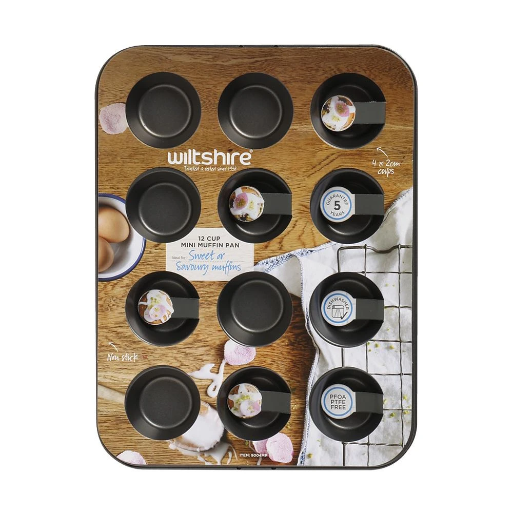 This Wiltshire Mini Muffin Pan is ideal creating bite sized muffins, or why not try it for mini frittata’s for the lunch box or your next party. The dark coating on the pan has the ability to transfer heat for even browning and heating. Made from carbon steel with a special non stick finish, baked goods slip right out making cleaning extra easy.