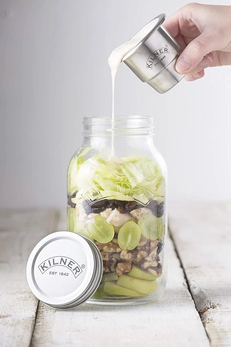The Kilner Glassware Food On The Go Jar is a portable, space-saving combo container designed to store, preserve, and transport both wet and dry meal components. Its signature, the airtight twist-top lid keeps food fresher, longer; while its stainless steel. the rim-suspended cup keeps sauces, oils, dressings, and moist foods in their own separate, spill-proof section. Kilner’s high-quality glass jars are durable, non-toxic, and non-porous, defining a versatile vessel as attractive as it is useful.