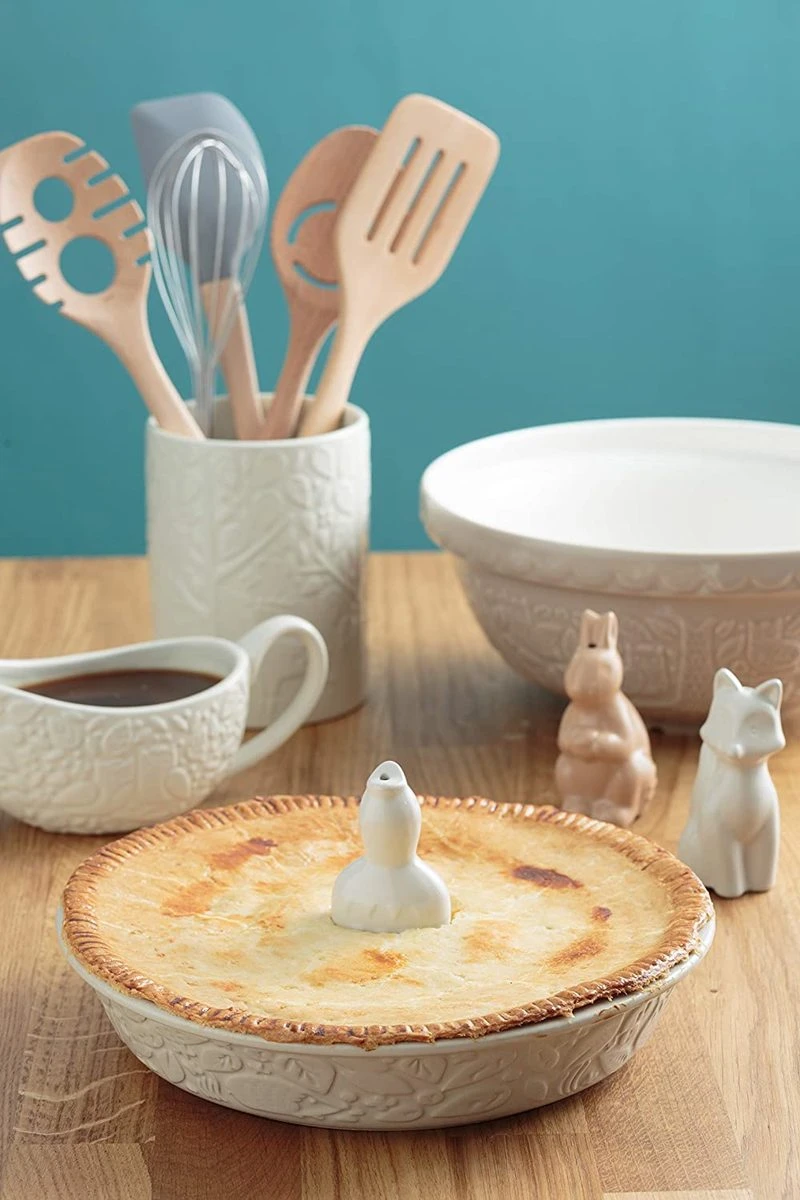 These sweet whimsical pie funnel made by Mason Cash is from the “In the Forest” line and is in the traditional bird shape. Will prevent your pie from boiling over and will keep the pastry from sagging. Hollow and open on the bottom, a single vent hole in the top.