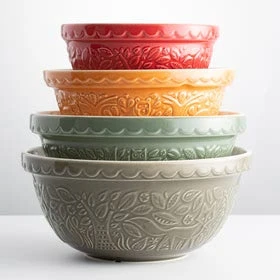 - Distinct patterned exterior and rim help bakers grip and tip the bowl