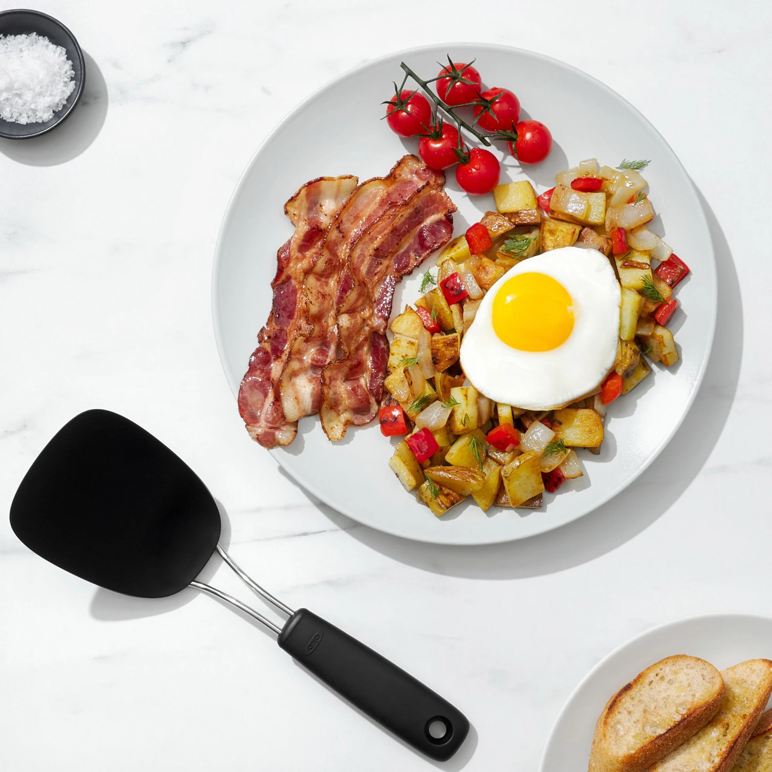This OXO Good Grips Nylon Flexible Turner features a flexible, non-stick silicone head that gently slips beneath delicate foods. Dishwasher safe, lifetime warranty.