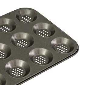Whether you are baking mini pecan or apple pies, this Bakemaster Perfect Crust Non Stick 12 Cup Shallow Baking Pan can handle the job. With perforation, this pan ensures each delectable piece gets a golden, crisp crust. And with the dual non-stick layer, you can forget about the struggle of releasing your goodies from the tin and cleaning up is a breeze.